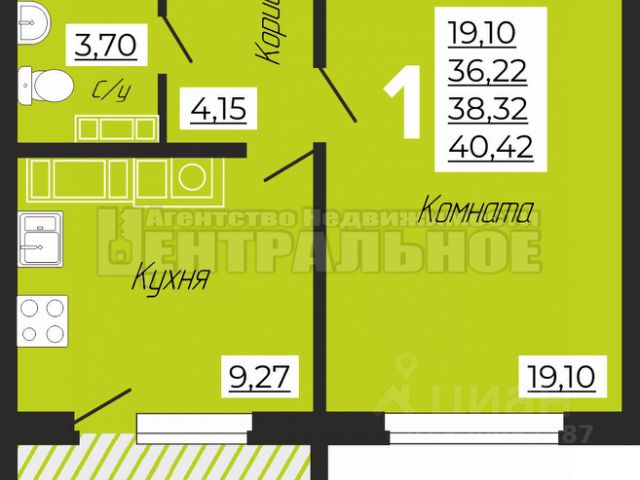Кухня 6 кв.м, комната с выступом для большой кровати - 19 кв.м, лоджия - 4 кв.м.