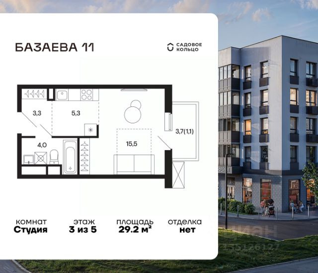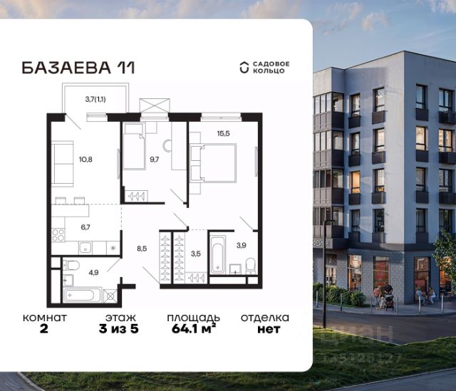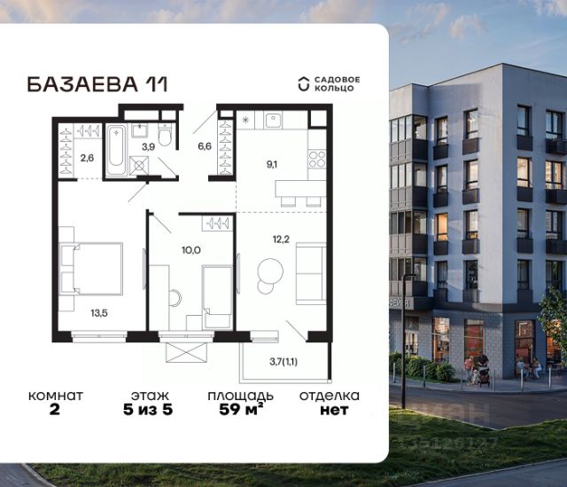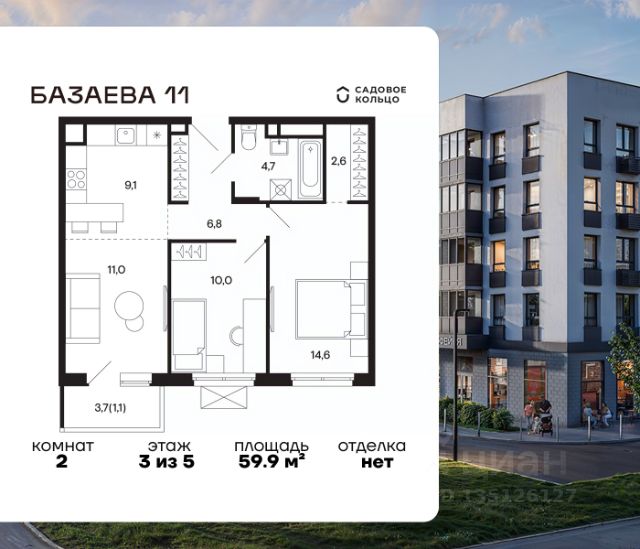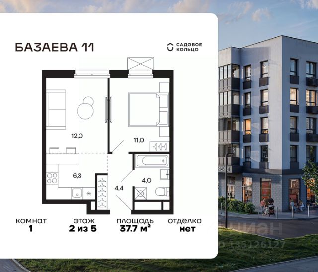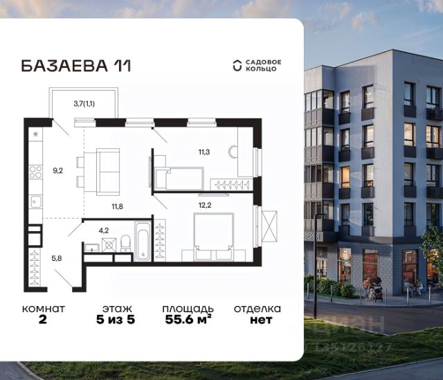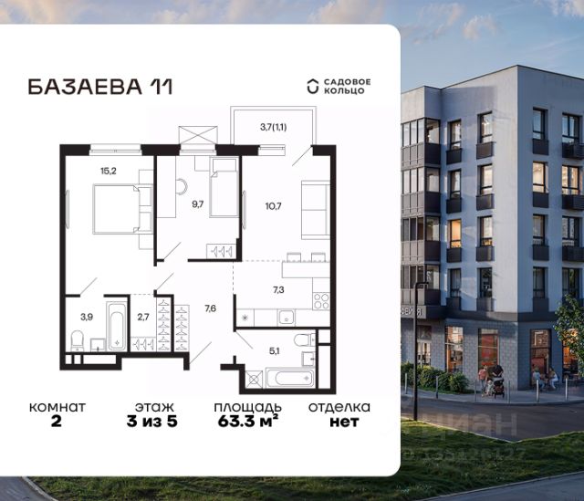 Продается квартира в ЖК "Базаева, 11" с 1 спальней на 1 этаже 5 этажного дома. Общая площадь: 46.8 кв.м. Высота потолков 3.62 м. Срок сдачи 2 квартал 2027 г. Эскроу-счет. Застройщик ГК "Садовое кольцо".