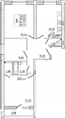 Продаётся 3-комнатная квартира в сданном доме (дом 1, секция 5), срок сдачи: IV-кв. 2024, общей площадью 67.74 кв.м., на 10 этаже. Расположение, транспортная доступность ЖК "Новый Смоленск" - это жилой комплекс эконом-класса, построенный в Ленинском районе Смоленска, в 7 километрах от центра города и недалеко от большого лесного массива. Рядом с комплексом расположена остановка автобусных маршрутов 26Н, 58Н, 31, 113, которые следуют через весь город. Удобство расположения новостройки обеспечивается ее нахождением в непосредственной близости от Киевского шоссе, которое на севере (3,2 километра) переходит в проспект Гагарина и в 4,6 километрах образует перекресток с крупной городской магистралью - улицей Кирова, а на юге, в 1,9 километрах, пересекается с Окружной дорогой. Чтобы добраться до железнодорожной станции Смоленск-Центральный и до автовокзала, нужно проехать 8,9 километров. Инфраструктура ЖК "Новый Смоленск" возведен в новом районе, где инфраструктура активно развивается. В одном из домов расположен центр дошкольной подготовки "Смайлик". Из ближайших к комплексу образовательных учреждений - детский сад 59 "Гномик" (посёлок Миловидово, 56) - в 1,3 километрах, а также Детский сад "Солнечный лучик" (поселок Одинцово, 34) - в 2,6 километрах, средняя общеобразовательная школа 9 (просп. Гагарина, 52) - в 4,1 километрах. Напротив комплекса находится торговый центр Gray, на территории которого открыты супермаркет "Магнит", аптека, булочная "Так, как дома". В самом ЖК работают аптека "Советская" и мясной магазин "Свежее мясо". В поселке Миловидово, в 800 метрах от ЖК, открыт супермаркет "Пятерочка". АГБУЗ Смоленская областная детская клиническая больница расположена в 4,9 километрах от дома. Спортивный комплекс "Ледовый дворец Смоленской государственной академии физической культуры и спорта" - в 4,7 километрах (просп. Гагарина, 23Г). Надежность застройщика ЖК "Новый Смоленск" строит ООО "Гражданстрой" (ООО "Грас"), которое присутствует на строительном рынке региона с 1999 года и входит в состав акционерного общества "Гражданстрой" (АО "Грас"), зарегистрированного 24 ноября 1993 года. Приоритетные виды работ, выполняемых АО "Грас" - создание архитектурных объектов, строительство жилых домов и нежилых зданий, проведение монтажных и отделочных работ. Разрешение на строительство корпусов ЖК было получено 28 августа 2015 года. В 2014 году сдан дом 56, дома 58 и 60 сданы в 2015-м, дом 55 сдан в 2017 году, сдача дома 2 назначена на 2019 год. Архитектура "Новый Смоленск" - это крупный жилой комплекс, который по замыслу застройщика должен представлять собой маленький город, на территории которого запланировано создание большого количества жилых домов, сети объектов инфраструктуры (школ, дошкольных детских учреждений, торговых, сервисных предприятий и пр.), а также нескольких паркингов. На данный момент комплекс состоит из пяти кирпичных 11-этажных домов. Несущие наружные стены зданий выложены из силикатного кирпича, утеплены плитами "Пен 3-комнатная квартира в дешевой новостройке в Смоленской области.