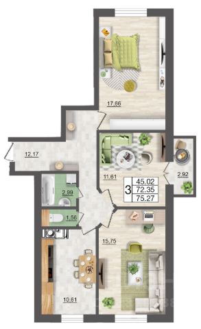Продаётся 3-комнатная квартира в сданном доме (дом 1, секции 3,4), срок сдачи: I-кв. 2025, общей площадью 74.41 кв.м., на 1 этаже. Расположение, транспортная доступность
