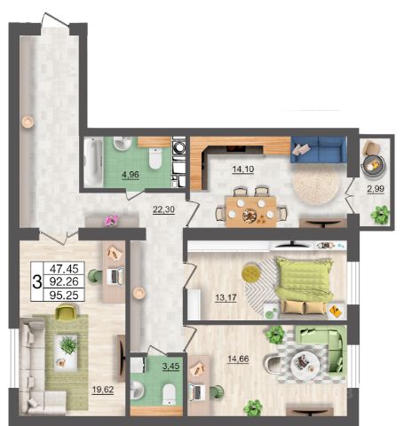 Продаётся 3-комнатная квартира в сданном доме (дом 1, секции 1,2), срок сдачи: II-кв. 2024, общей площадью 74.29 кв.м., на 10 этаже. Расположение, транспортная доступность