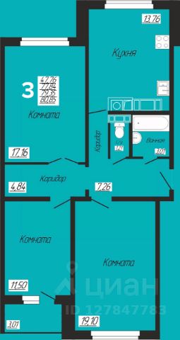 Общая площадь - 79 кв.м., жилая площадь - 47.2 кв.м., кухня - 12.2 кв.м.