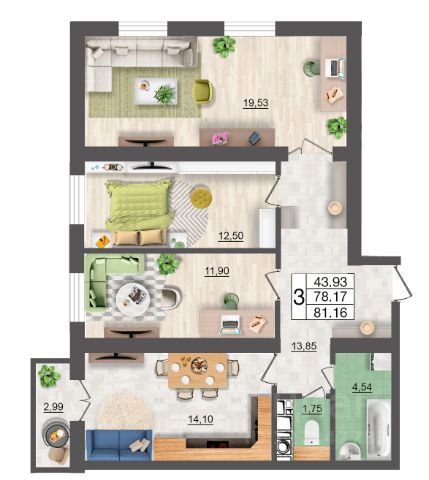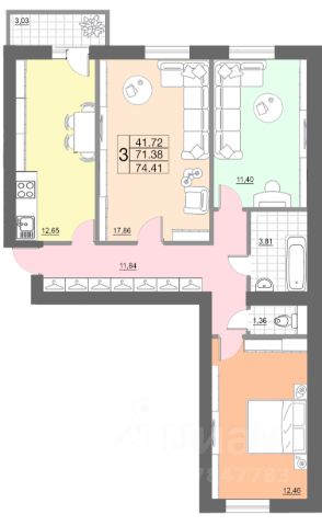 Продаётся 3-комнатная квартира в сданном доме (дом 1, секции 3,4), срок сдачи: I-кв. 2025, общей площадью 74.41 кв.м., на 1 этаже. Расположение, транспортная доступность ЖК "Новый Смоленск" - это жилой комплекс эконом-класса, построенный в Ленинском районе Смоленска, в 7 километрах от центра города и недалеко от большого лесного массива. Рядом с комплексом расположена остановка автобусных маршрутов 26Н, 58Н, 31, 113, которые следуют через весь город. Удобство расположения новостройки обеспечивается ее нахождением в непосредственной близости от Киевского шоссе, которое на севере (3,2 километра) переходит в проспект Гагарина и в 4,6 километрах образует перекресток с крупной городской магистралью - улицей Кирова, а на юге, в 1,9 километрах, пересекается с Окружной дорогой. Чтобы добраться до железнодорожной станции Смоленск-Центральный и до автовокзала, нужно проехать 8,9 километров. Инфраструктура ЖК "Новый Смоленск" возведен в новом районе, где инфраструктура активно развивается. В одном из домов расположен центр дошкольной подготовки "Смайлик". Из ближайших к комплексу образовательных учреждений - детский сад 59 "Гномик" (посёлок Миловидово, 56) - в 1,3 километрах, а также Детский сад "Солнечный лучик" (поселок Одинцово, 34) - в 2,6 километрах, средняя общеобразовательная школа 9 (просп. Гагарина, 52) - в 4,1 километрах. Напротив комплекса находится торговый центр Gray, на территории которого открыты супермаркет "Магнит", аптека, булочная "Так, как дома". В самом ЖК работают аптека "Советская" и мясной магазин "Свежее мясо". В поселке Миловидово, в 800 метрах от ЖК, открыт супермаркет "Пятерочка". АГБУЗ Смоленская областная детская клиническая больница расположена в 4,9 километрах от дома. Спортивный комплекс "Ледовый дворец Смоленской государственной академии физической культуры и спорта" - в 4,7 километрах (просп. Гагарина, 23Г). Надежность застройщика ЖК "Новый Смоленск" строит ООО "Гражданстрой" (ООО "Грас"), которое присутствует на строительном рынке региона с 1999 года и входит в состав акционерного общества "Гражданстрой" (АО "Грас"), зарегистрированного 24 ноября 1993 года. Приоритетные виды работ, выполняемых АО "Грас" - создание архитектурных объектов, строительство жилых домов и нежилых зданий, проведение монтажных и отделочных работ. Разрешение на строительство корпусов ЖК было получено 28 августа 2015 года. В 2014 году сдан дом 56, дома 58 и 60 сданы в 2015-м, дом 55 сдан в 2017 году, сдача дома 2 назначена на 2019 год. Архитектура "Новый Смоленск" - это крупный жилой комплекс, который по замыслу застройщика должен представлять собой маленький город, на территории которого запланировано создание большого количества жилых домов, сети объектов инфраструктуры (школ, дошкольных детских учреждений, торговых, сервисных предприятий и пр.), а также нескольких паркингов. На данный момент комплекс состоит из пяти кирпичных 11-этажных домов. Несущие наружные стены зданий выложены из силикатного кирпича, утеплены плитами "Пен