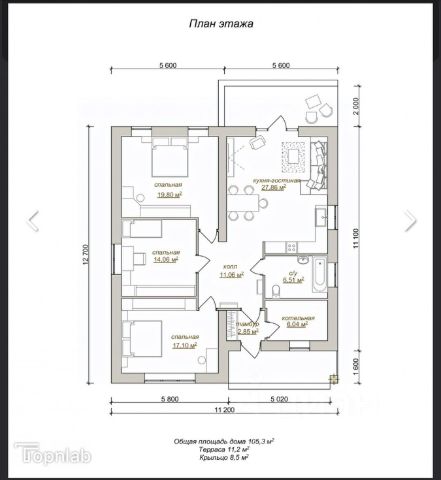 В доме хорошая планировка: кухня-гостиная 36.1 кв.м, 2 спальни 16.5+19 кв.м, кабинет 21,2 кв.м, 2 санузла, котельная и прихожая с вместительным местом хранения 11,3 кв.м.