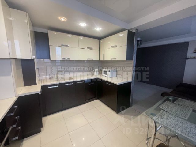 •просторная кухня-гостиная с вместительным кухонным гарнитуром, с встроенной техникой, обеденным столом, удобным диваном, фартук из керамогранита, различные сценарии освещения, стеновые панели/плинтус из дюрополимера, стены выровнены и покрашены.