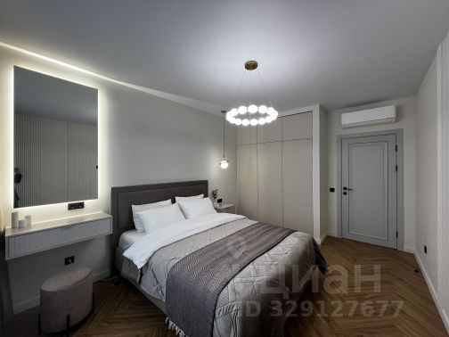 •спальня оснащена кроватью с подъемным механизмом и ортопедическим матрасом, подсветка по периметру, прикроватные тумбы , зеркало с сенсорной подсветкой, комфортный прикроватный пуфик, вместительный шкаф, различные сценарии освещения, шторы блэкаут, скрытые карнизы, кондиционер.