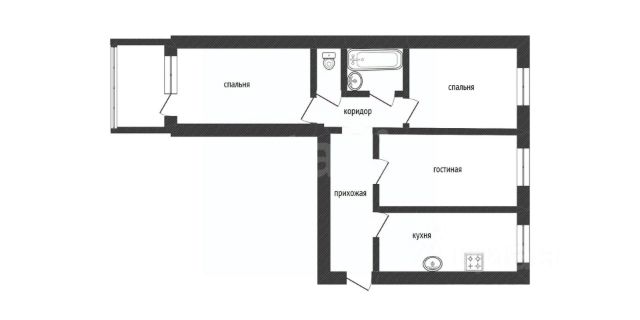 Кухня 6 кв.м, комната с выступом для большой кровати - 19 кв.м, лоджия - 4 кв.м.