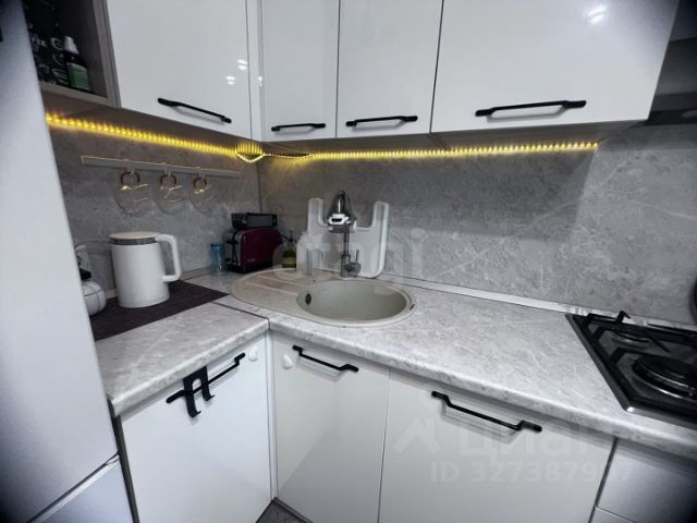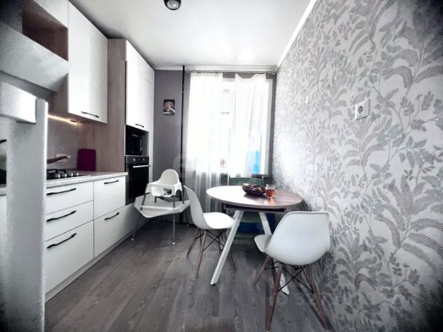 Кухня площадью 9 квадратных метров оборудована необходимой бытовой техникой, включая холодильник, стиральную машину и посудомоечную машину. В комнате установлен вместительный шкаф для хранения вещей.