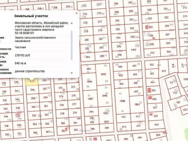 Земельный участок площадью 840 кв. М. Категория: земли сельскохозяйственного назначения. Вид разрешенного использования: дачное строительство. Кадастровый номер участка: 50:18:0040101:354. Адрес: Московская область, Можайский район, участок расположен в юго-западной части кадастрового квартала 50:18:0040101, Тсн Лесное 2.