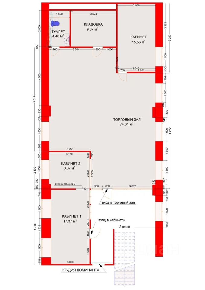 Торговый зал 75 кв.м., кабинет 1 - 17 кв.м, кабинет 2 - 9 кв.м., кладовка и туалет - 15 кв.м.