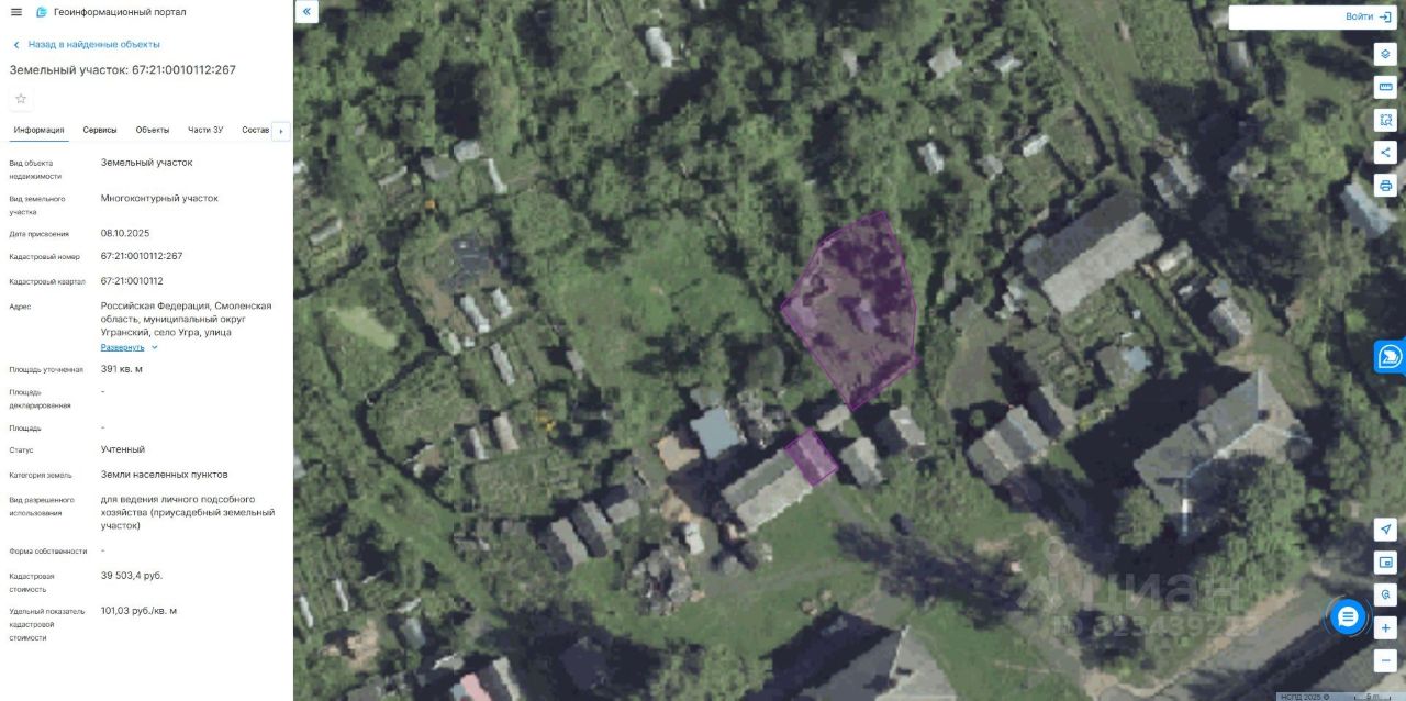 Земельный участок, площадью 391 кв. м. с кадастровым номером 67:21:0010112:267, местоположение: Российская Федерация, Смоленская область, Угранский муниципальный округ, село Угра, улица Краснознамённая, из земель населенных пунктов, с разрешенным использованием: "для ведения личного подсобного хозяйства (приусадебный земельный участок)"