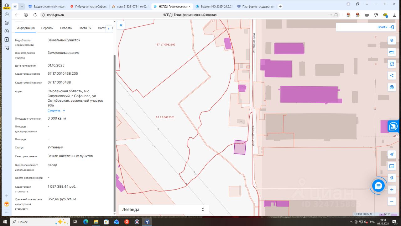 Земельный участок категории земель населенных пунктов с кадастровым номером 67:17:0010438:205 площадью 3000 кв.метров, разрешенного использования склад, расположенный по адресу: Российская Федерация, Смоленская область, Сафоновский муниципальный округ, г. Сафоново, ул. Октябрьская, земельный участок 93а.