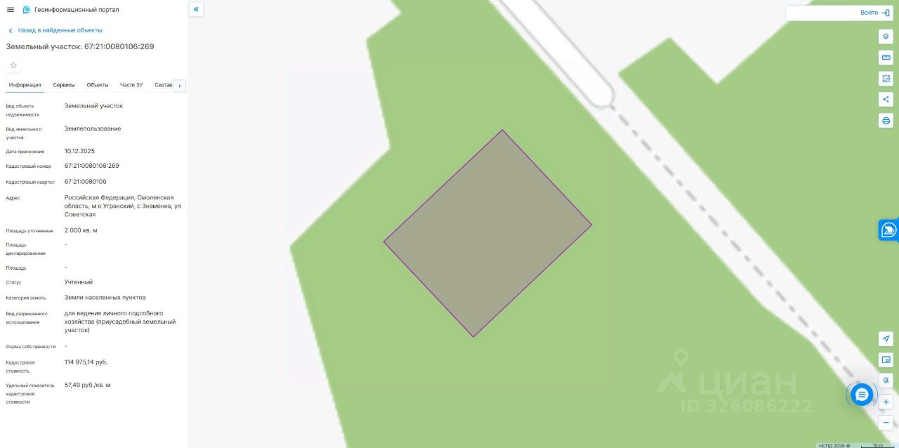 Земельный участок из категории земель населенных пунктов с кадастровым номером 67:21:0080106:269 площадью 2000 кв.м., расположенный по адресу: Российская Федерация, Смоленская область, Угранский муниципальный округ, село Знаменка, улица Советская, с разрешенным использованием "для ведения личного подсобного хозяйства (приусадебный земельный участок)".