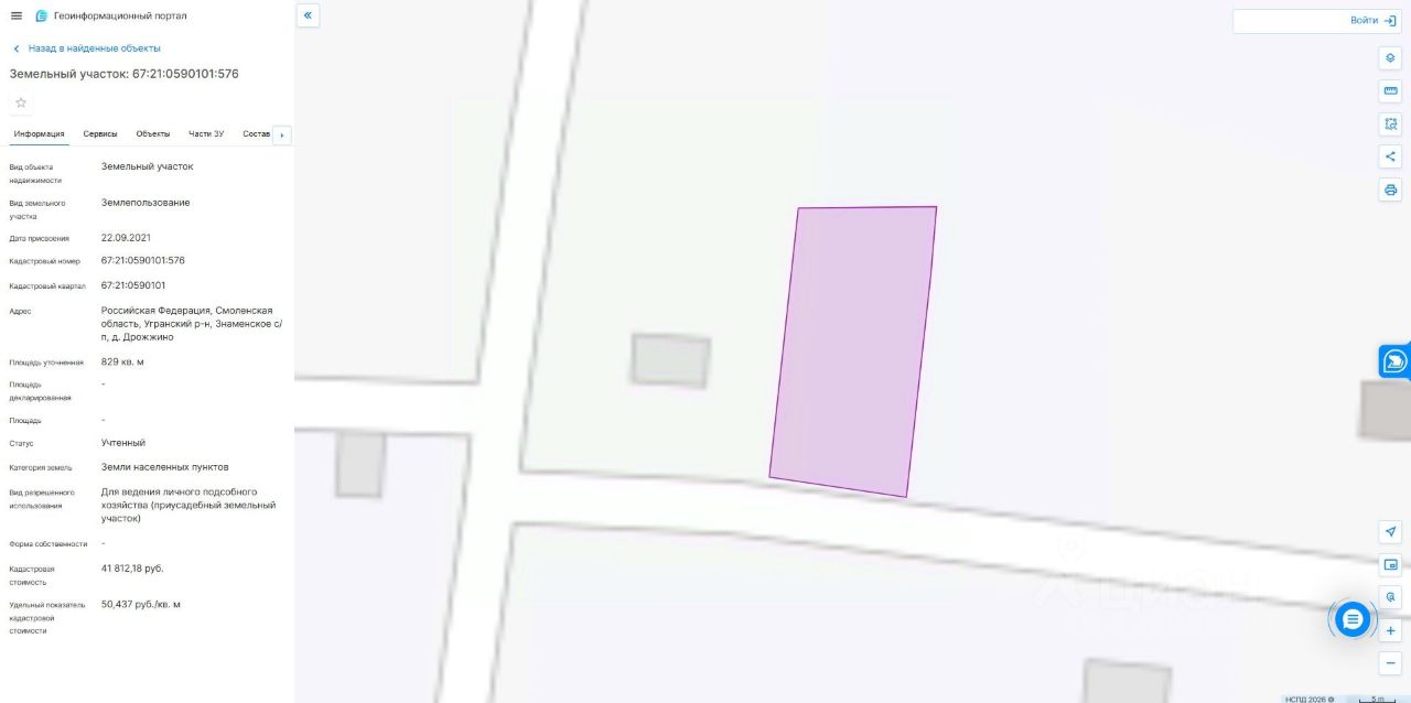 Земельный участок из категории земель населенных пунктов с кадастровым номером 67:21:0590101:576 площадью 829 кв.м., расположенный по адресу: Российская Федерация, Смоленская область, Угранский муниципальный округ, деревня Дрожжино, с разрешенным использованием "для ведения личного подсобного хозяйства (приусадебный земельный участок)".