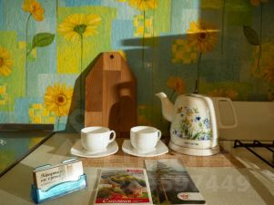 Компактная кухня оборудована современной мебелью и всей нужной для длительного проживания бытовой техникой. В распоряжении гостей квартиры полный комплект посуды и кухонной утвари на четыре персоны, чтобы чувствовать себя как дома и готовить привычный рацион по своему вкусу.