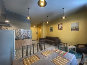 Есть вся необходимая базовая посуда. Квартира полностью оборудована техникой - плитой, микроволновкой, холодильником, стиральной машиной, феном, утюгом.