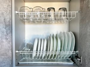 Оборудованная кухня, полный комплект посуды для приготовления и приёма пищи