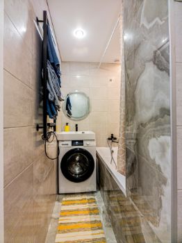 Интерьер оформлен в современных тонах: каждый элемент продуман до мелочей, создавая гармоничную атмосферу домашнего уюта. Для поддержания комфортного микроклимата в квартире есть кондиционер , а просторная кухня полностью оснащена бытовой техникой (холодильник, плита, микроволновая печь, электрический чайник и др.) и обеденной зоной . В ванной комнате вы найдете качественную сантехнику и стиральную машину — то, что особенно важно для семей с детьми или при долгосрочном проживании. Кроме того, в квартире проведен высокоскоростной Wi-Fi , свободная парковка (при наличии мест) обеспечивают дополнительное удобство.