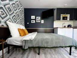 Номер уютно обставлен и оснащён необходимым, чтобы отдохнуть после долгого и насыщенного дня. Имеются телевизор. Перечисленные услуги есть не во всех номерах.