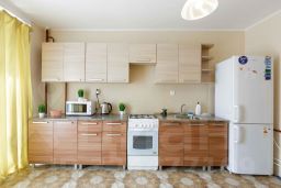 - полноценная кухня с обеденной зоной, оборудованная плитой, чайником, холодильником и кухонными приборами