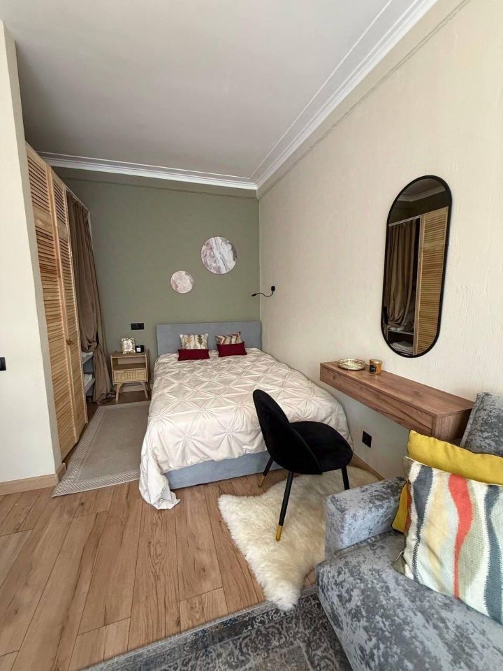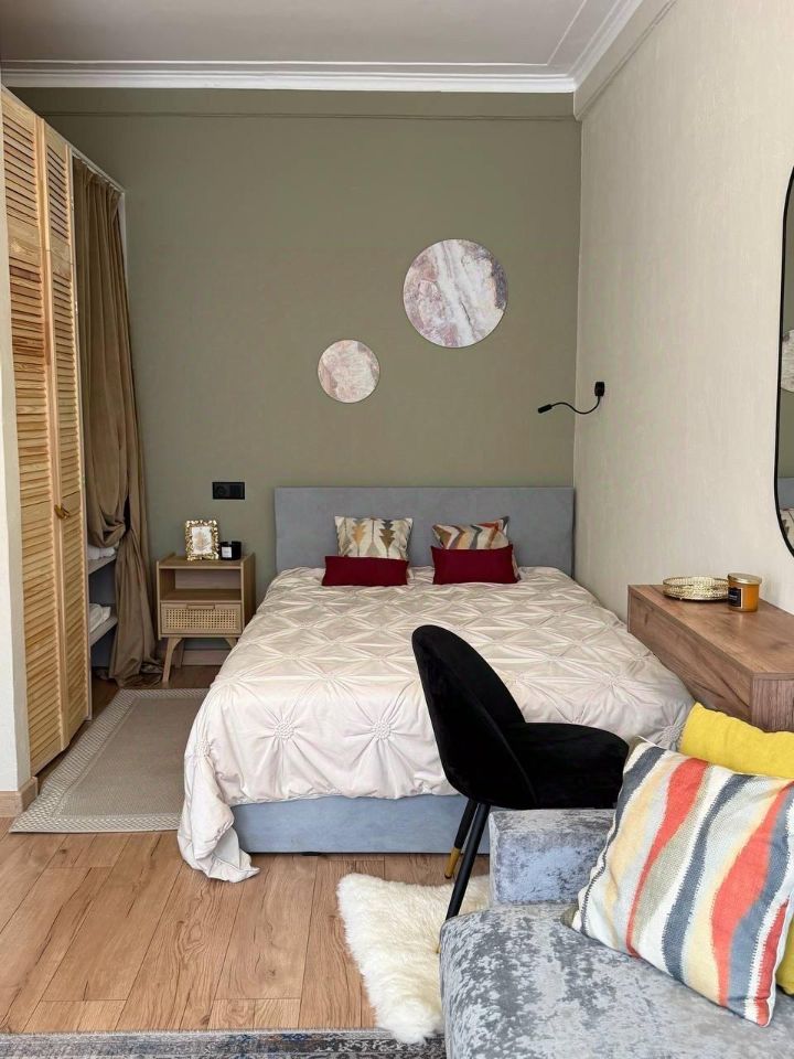 Бохо-стиль здесь раскрывается во всей красе: мягкие текстильные акценты, плетеные корзины с зеленью, этнические ковры и винтажные детали создают ощущение теплого, свободного уюта, словно вы в гостях у творческой души. Просторная гостиная с удобным диваном манит к чтению книг или вечерним разговорам, а кухня позволит наслаждаться ароматным кофе.