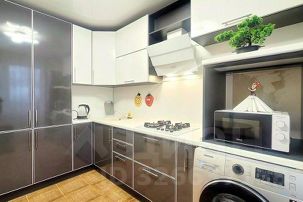 Оборудованная кухня (духовка, микроволновка, чайник, посуда)