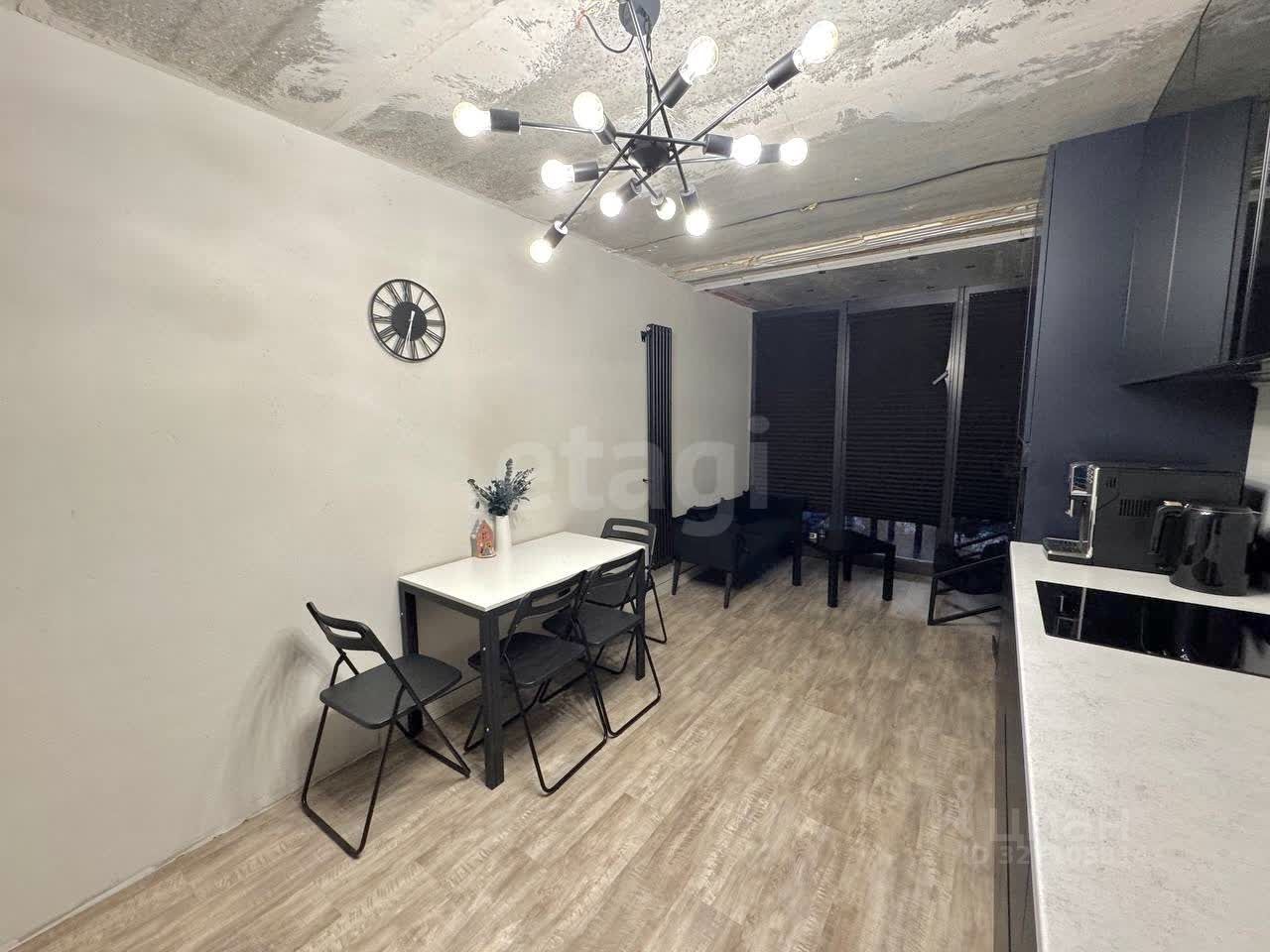 Кухонный гарнитур со встроенной техникой. Кухонный стол и стулья.