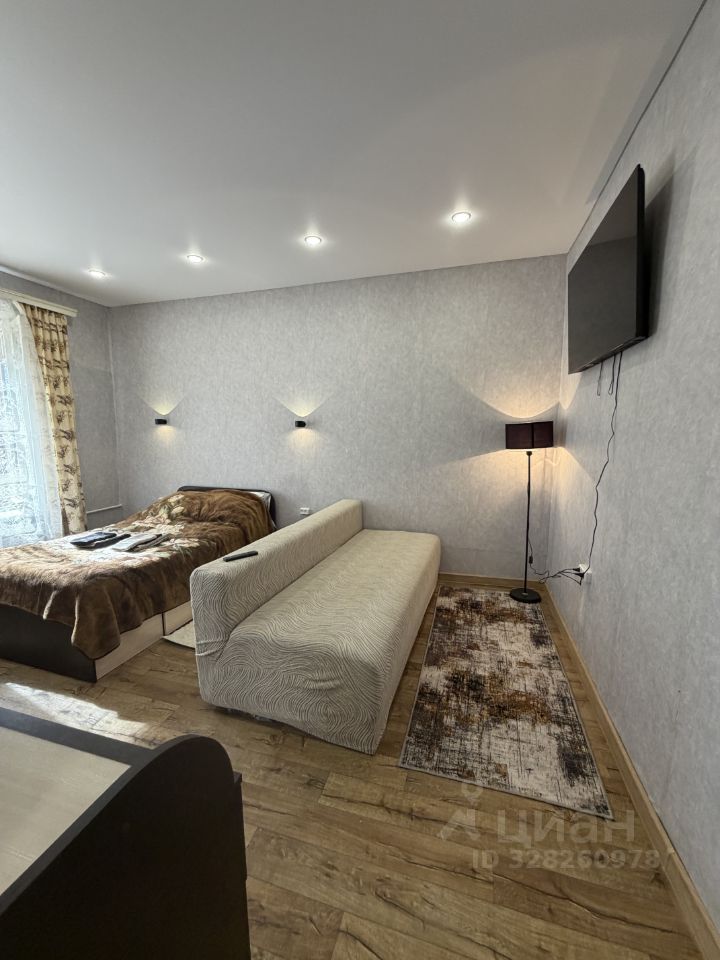 Гостиная зона с мягким диваном и телевизором — место для отдыха после насыщенного дня.