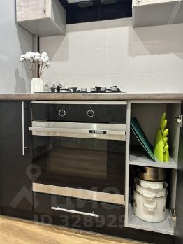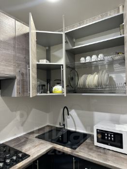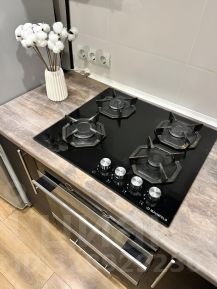 Кухня оборудована современной техникой: есть холодильник, плита, микроволновая печь и стиральная машина. А так же необходимая посуда для жизни- тарелки, кружки, кастрюли, ножи, столовые приборы, а так же миксер