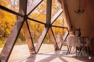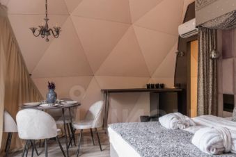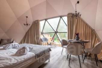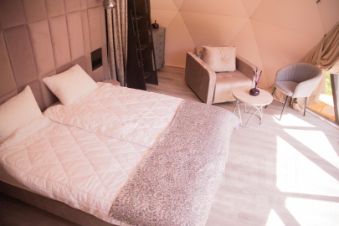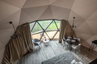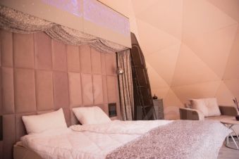 Геокупол Сьют "Замки Луары" — это один из семи видов наших уникальных купольных домов. Дом имеет просторную комнату с огромной кроватью напротив панорамного окна и очень необычный мезонин на втором этаже.