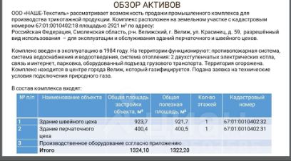 Продается промышленный комплекс для производства трикотажной продукции. Комплекс расположен в центре города Велиж, на земельном участке 2921кв. М. Здание площадью 1324.1 кв. М., рядом находится школа. На территории функционируют противопожарная система, система водоснабжения, система отопления, связь, интернет, Территория огорожена. Цена указана без производственного оборудования.
