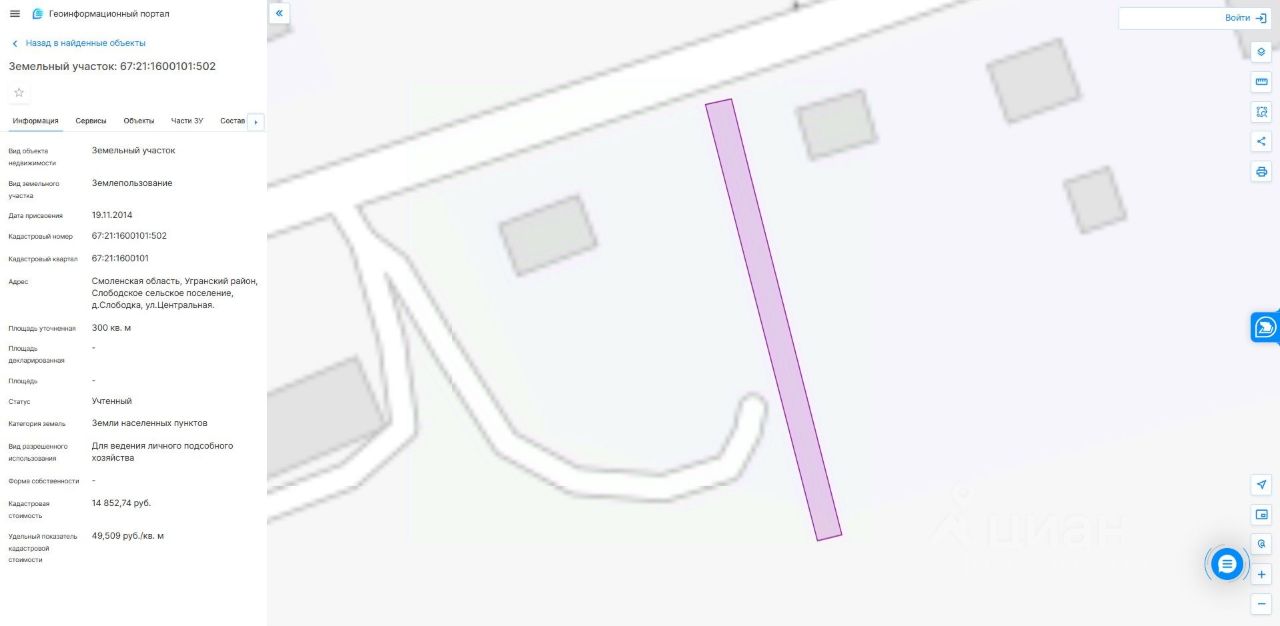 Земельный участок с кадастровым номером 67:21:1600101:502, площадью 300 кв.м., местоположение: Смоленская область, Угранский муниципальный округ, деревня Слободка, улица Центральная, из земель населенных пунктов, с разрешенным использованием: "для ведения личного подсобного хозяйства"