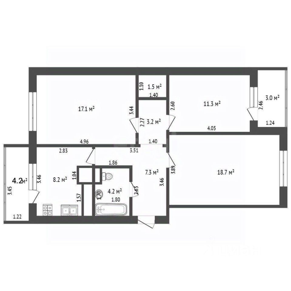 Общая площадь - 79 кв.м., жилая площадь - 47.2 кв.м., кухня - 12.2 кв.м.