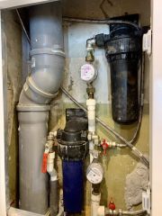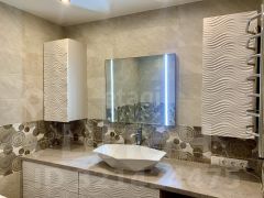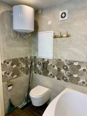 На входе в квартиру нас встречает расширенный вход с новой широкой дверью, в прихожей плитка керамогранит и шкаф, слева располагается просторный сан.узел 5.5 м2, который имеет большую зону хранения, большую ванну и накопительный котел, отдельно выведены и скрыты коммуникации с комфортной доступностью, рабочая электрическая вентиляция, плитка в сан.узле глиняная, что сохраняет комнату от известковых разводов, скоплению влажности и избавляет пространство от звонкости.