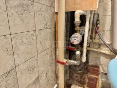 Санузел совмещен, счётчики расхода воды горячего и холодного водоснабжения установлены.
