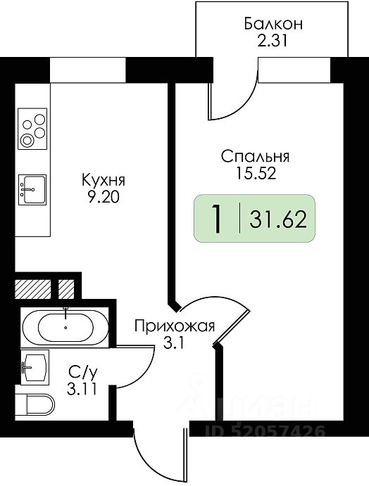 1-комн. от 32,09 м²