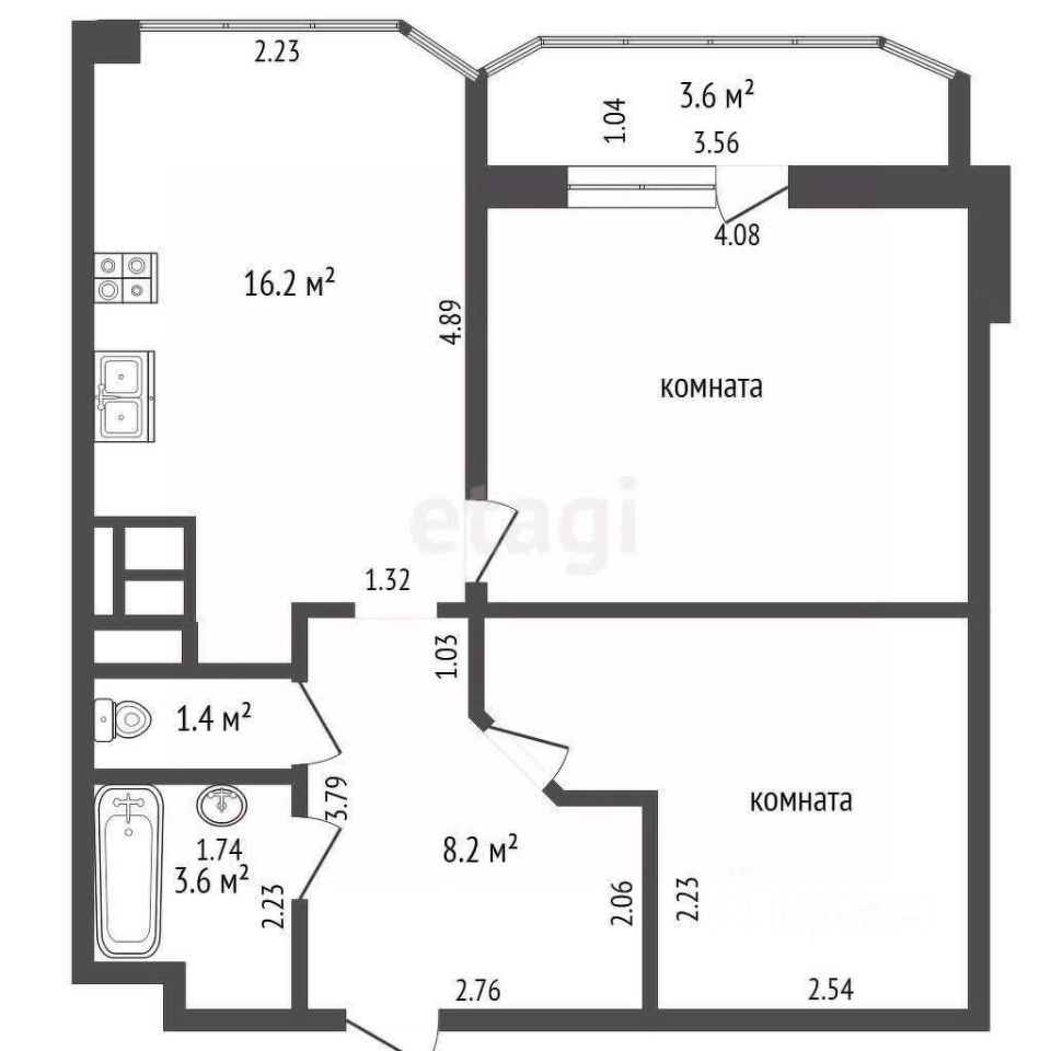Общая площадь-60.5 кв.м., жилая-27.4 кв.м., кухня-16.2 кв.м.