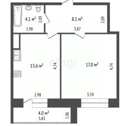 Общая площадь-42.8 кв.м. без учета лоджии, жилая площадь-17 кв.м. кухня-13.6 кв.м.