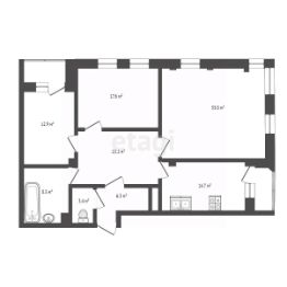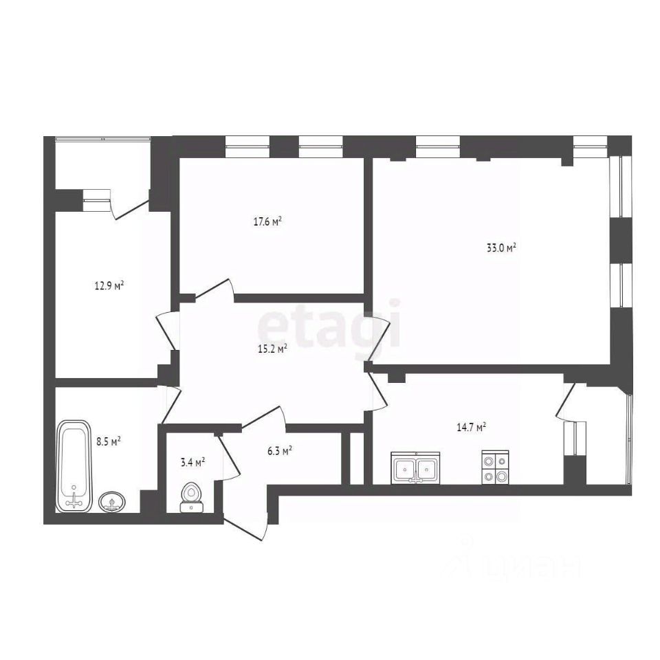 Планировка отличается рациональным зонированием: изолированные спальни площадью 17 и 13 кв.м, гостиная 33 кв.м, объединенная с кухней-столовой 14.7 кв.м, формирует единое светлое пространство для жизни и приема гостей.