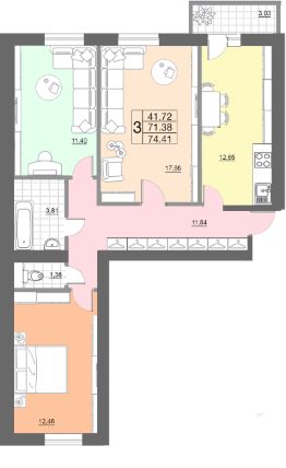 Продаётся 3-комнатная квартира в сданном доме (дом 1, секции 3,4), срок сдачи: I-кв. 2025, общей площадью 74.41 кв.м., на 1 этаже. Расположение, транспортная доступность