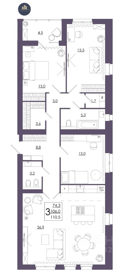 Продаётся 3-комнатная квартира в строящемся доме (Дом 2 ), срок сдачи: II-кв. 2027, общей площадью 110.5 кв.м., на 7 этаже. Перспективный проект.