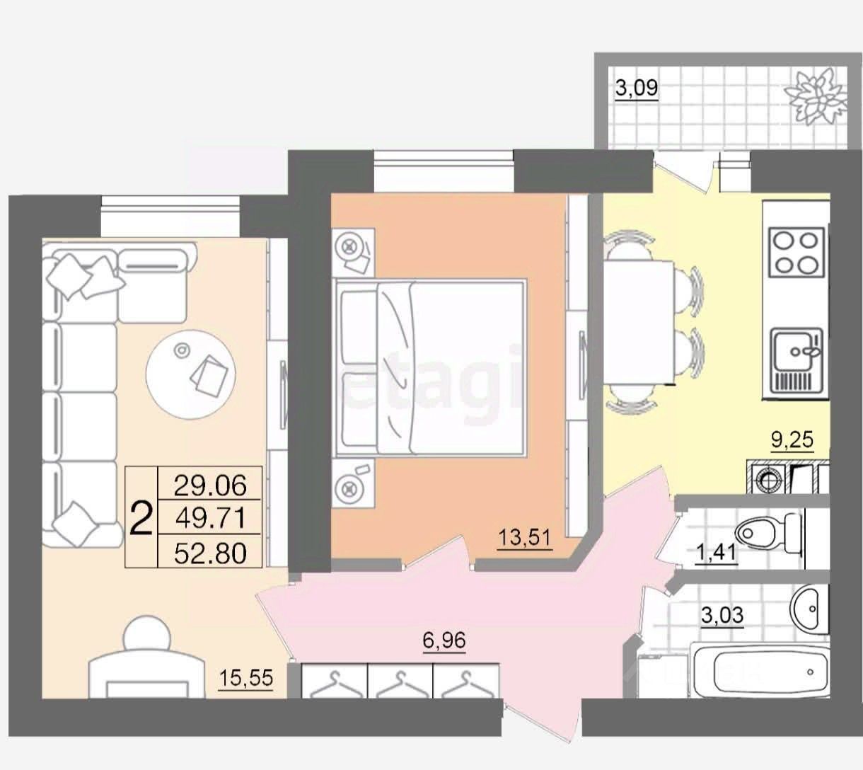 Общая площадь-49.3 кв.м., жилая-29 кв.м., кухня-9.3 кв.м.
