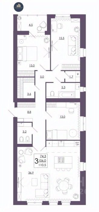 Продаётся 3-комнатная квартира в строящемся доме (Дом 2 ), срок сдачи: II-кв. 2027, общей площадью 110.5 кв.м., на 8 этаже. Перспективный проект.