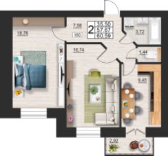 Продаётся 2-комнатная квартира в строящемся доме (дом 9 (секции 3,4)), срок сдачи: II-кв. 2027, общей площадью 60.59 кв.м., на 4 этаже. Расположение, транспортная доступность ЖК "Лазурный" - это многоквартирный жилой комплекс комфорт-класса, построенный в Ленинском районе - в 350 метрах от лесопарковой зоны, в 1,2 километрах от реки Кловка, в 2,1 километрах от берега реки Днепр, в десяти минутах езды на автомобиле до центра города (около 7,5 километров). До железнодорожного вокзала Смоленск-Центральный - 8,5 километров. От ближайшей к комплексу остановки городского транспорта отправляется несколько маршрутов по всему городу. В 3,8 километрах расположена зеленая зона - городской парк Реадовский, в центре которого находится памятник архитектуры Курган Бессмертия. В 1,1 километре - городская достопримечательность "Источник". Инфраструктура В соседнем с ЖК "Лазурный" доме расположен продуктовый магазин "Лаваш". На сегодняшний день ближайший к комплексу детский сад 57 - в 2,5 километрах, рядом с ним находятся Смоленский строительный колледж и медцентр-поликлиника "Семейный доктор". Смоленский автотранспортный колледж им. Е.Г. Трубицына - в 3,5 километрах, МБДОУ детский сад 78 Исток - в 3,1 километрах, МБОУ средняя общеобразовательная школа 21 им. Н.И. Рыленкова - в 2,5 километрах, детский сад 63 "Золотой петушок" в 2,5 километрах. На Краснинском шоссе, в пределах двух километров от ЖК, открыты: ТЦ "Этажи", магазины сантехники и электротоваров, кофейня "Чародейка", супермаркеты "Магнит" и "Семеновский", оптовый магазин продуктов "Лаваш". До ближайшего кинотеатра "Современник" 5,2 километра. Возле него работают универмаг "ЦУМ", расположено большое количество ресторанов и кафе. Надежность застройщика Строит ЖК "Лазурный" ООО "Континент" (предприятие зарегистрировано в апреле 2006 года), которое является дочерней компанией акционерного общества "Гражданстрой" (АО "Грас"), зарегистрированного 24 ноября 1993 года. Организация специализируется на создании архитектурных объектов, строительстве жилых домов, а также проводит строительно-монтажные и отделочные работы. Разрешение на строительство дома 6 выдано 17 апреля 2017 года, окончание запланировано на четвертый квартал 2019-го. Строительство дома 7 начато в 2015 году, завершено в конце 2017-го. Дом 8 сдан 30 июня 2016 года. Архитектура Проектом масштабной застройки ЖК "Лазурный" предусмотрено создание более 20 домов с полным комплексом инфраструктурных объектов. На данный момент сдано два жилых корпуса, еще один в - процессе строительства. Наружные стены зданий трехслойные, сложены из силикатного кирпича, утеплены плитами "Пеноплекс", для облицовки использован декоративный силикатный кирпич в бежево-коричневых тонах. Дом 6 - 12-этажное жилое здание на 530 квартир. Дом 7 - 12-этажный, на 360 квартир (220 однокомнатных, 109 двухкомнатных, 31 трехкомнатная). Дом 8 - на 250 квартир (150 - однокомнатных, 70 - двухкомнатных, 30 - трехкомнатных). На первом этаже дома выделены помещения по