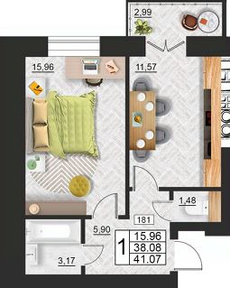 Общая площадь41,07 м²