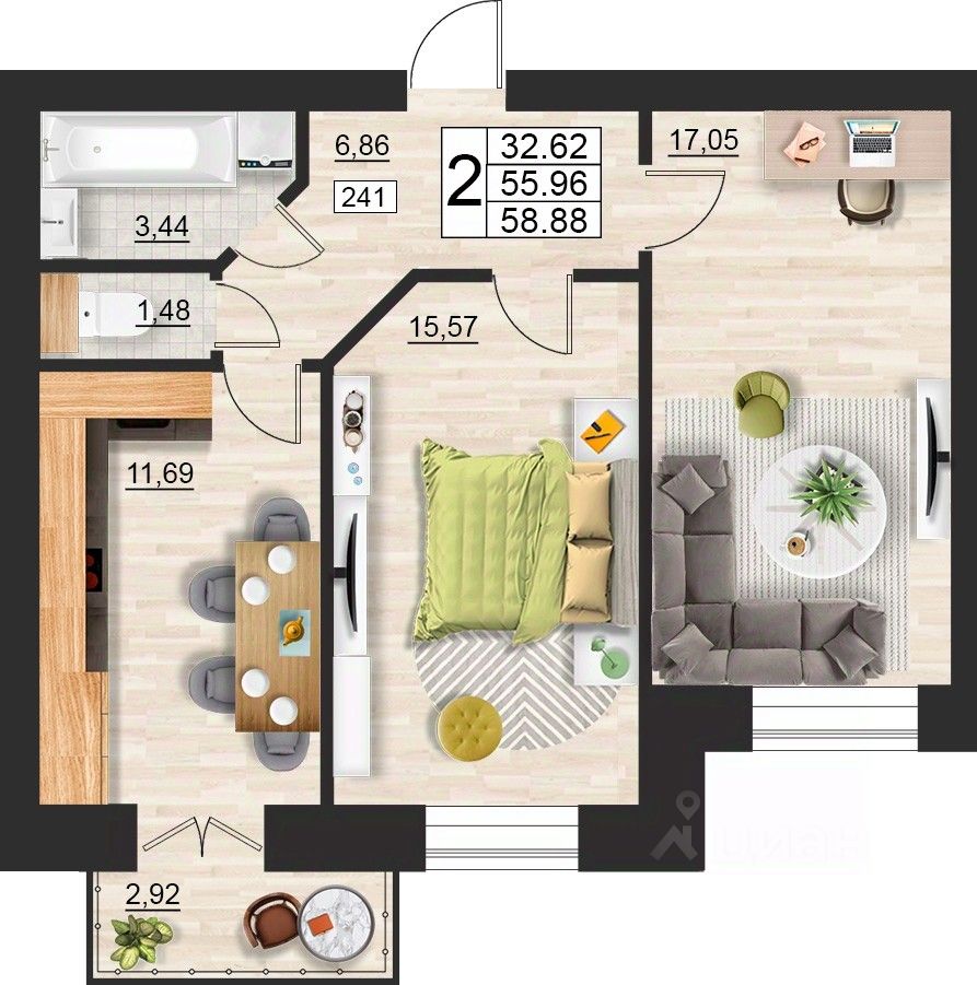 Общая площадь58,88 м²
