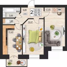 Общая площадь58,75 м²