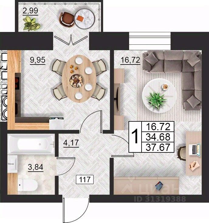Общая площадь37,67 м²