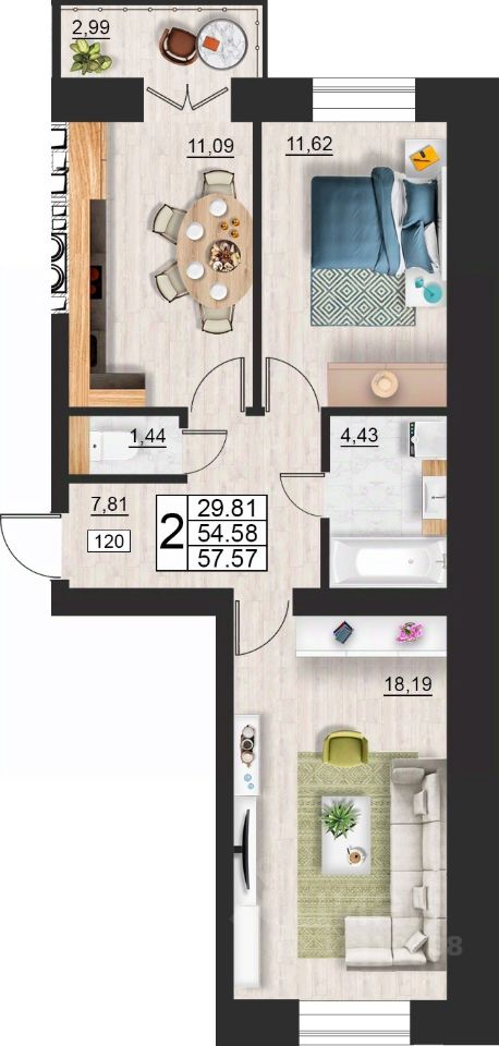 Общая площадь57,57 м²