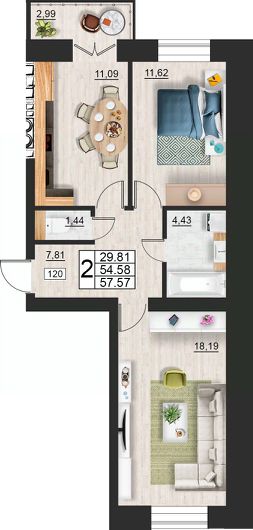 Продаётся 2-комнатная квартира в строящемся доме (дом 9 (секции 3,4)), срок сдачи: II-кв. 2027, общей площадью 57.57 кв.м., на 7 этаже. Расположение, транспортная доступность